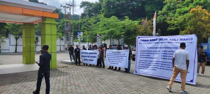 JAYAPURA – Sekelompok masyarakat adat yang mengatasnamakan Ondoafi Besar Tobati Enggros mengelar aksi penyampaian aspirasi dan melakukan pemalangan terhadap kantor Badan Pertanahan Nasional (BPN) Kota Jayapura di Abepura, Pada Jumat (14/11/).