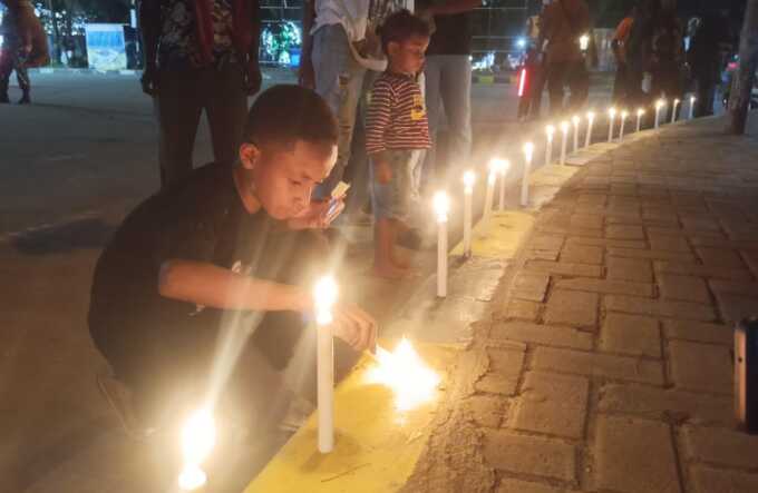 SENTANI – Aksi menyalakan 1000 lilin digelar sebagai bentuk duka mendalam atas kepergian almarhumah Irene Sokoy bersama bayi yang belum sempat dilahirkan. Kegiatan ini dipimpin oleh Ketua Lembaga Pemberdayaan Perlindungan Perempuan dan Anak Adat (LP3A2P) Provinsi Papua yang juga merupakan Ketua Ikatan Perempuan Asal Sentani (IPAS), Rita Tokoro. Kegiatan dilakukan di depan Jl Bandara Sentani, Kamis (27/11) malam.