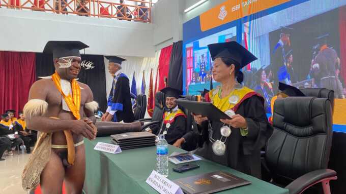 Satu per satu wisudawan menjalani ritual sakral ketika kuncir toga wisuda mereka digeser dari sisi kiri ke kanan. Ritual itu menjadi penanda bahwa mereka resmi lulus dari kampus tempat mereka menimba ilmu selama ini. Ada yang berbeda dalam acara wisuda ini, saat sebagian besar mahasiswa masih identik dengan mengenakan toga hitam dan jubah panjang saat melaksanakan wisuda, seorang wisudawan asal Papua Pegunungan justru tampil berbeda.