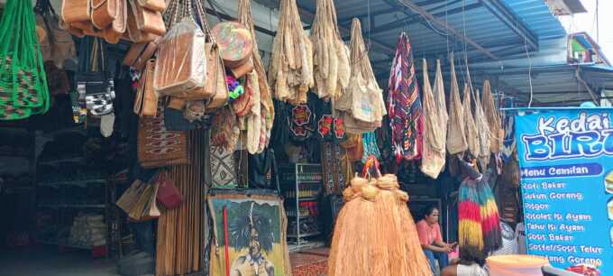 Disalahsatu gerai bernama Asmat Jaya, Haji Anto duduk di depan etalase berisi patung ukiran kayu, topi bulu kasuari, dan noken warna-warni. Ia menatap dagangannya yang sebagian besar didatangkan dari Merauke, Wamena, bahkan ada juga yang diperoleh dari Papua Nugini (PNG). Bentuknya seperti ukiran patung.