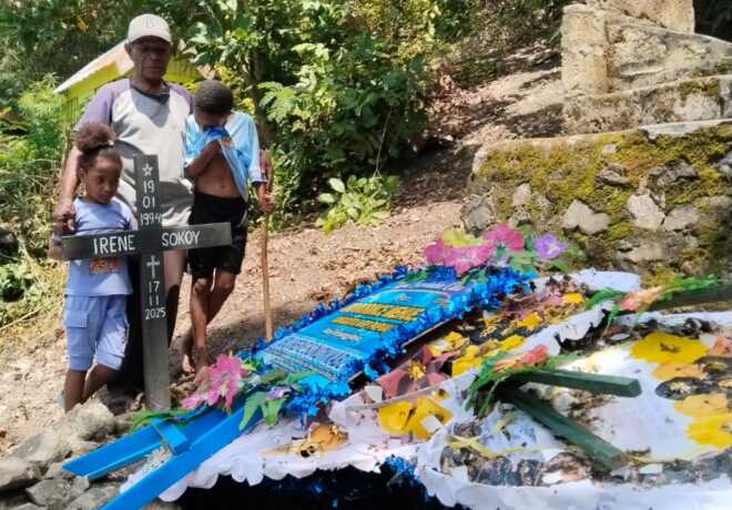Di antara mereka, satu gundukan tanah masih tampak baru, dipenuhi rangkaian bunga kertas yang warnanya cerah namun terasa muram. Disanalah Irene Sokoy disemayamkan. Wanita kelahiran Januari 1994 ini terbaring untuk selamanya. Ayah mertua Irene, Abraham Kabey, berdiri tepat disisi kubur sambil menggenggam tangan kedua cucunya, Yohan Kalvin Kabey (11) dan Alfonsina Ivon Kabey (6).