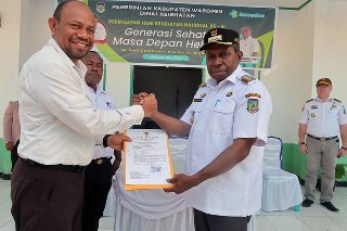 WAROPEN – Bupati Waropen, Drs. F.X Mote, M.Si, SK Pelaksana Tugas (Plt.) Kepala Dinas Kesehatan Waropen kepada dr. Jenggo Suwarko. Penyerahan SK Plt. Nomor: 821.2.2 – 022 ini dilakukan langsung oleh Bupati di Kantor Dinas Kesehatan, tak lama setelah pelaksanaan apel peringatan Hari Kesehatan Nasional (HKN) ke-61.