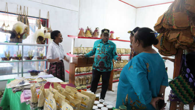 WAROPEN — Bupati Waropen, Drs. Fransiskus Xaverius Mote, M.Si, bersama Ketua Tim Penggerak PKK Kabupaten Waropen, Ny. Bernadeta Goo Mote, hari ini melakukan kunjungan kerja penting ke koperasi Galeri Putri Bakau Waropen yang berlokasi di Kampung Sanggei.