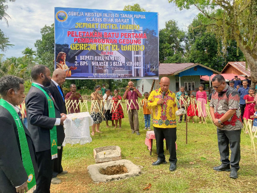 Peletakan batu pertama pembangunan gedung gereja baru Jemaat GKI Bethel Wardo dilakukan langsung oleh Bupati Biak Numfor Markus Octovianus Mansnembra, SH.,MM, Minggu (02/11).