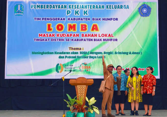 BIAK — Dalam rangka memperingati Hari Pangan Nasional dan mendukung program ketahanan pangan, TP-PKK Kabupaten Biak Numfor menggelar lomba masak kudapan berbahan lokal tingkat distrik se-Kabupaten Biak Numfor. Kegiatan ini bertemakan Meningkatkan Kesadaran akan B2SA (Beragam, Bergizi, Seimbang dan Aman) dan Potensi Sumber Daya Lokal, dengan tujuan untuk menggali potensi kuliner lokal serta meningkatkan keterampilan dan pengetahuan anggota PKK dalam mengelola bahan pangan lokal yang bergizi.