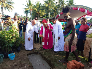 Diawali dengan pemberkatan oleh Uskup Agung Merauke Mgr Petrus Canisius Mandagi. Setelah pemberkatan, dilanjutkan dengan prosesi adat, dimana seekor babi jantan dibunuh dengan cara ditoki (dipukul pada bagian kepala,red) dengan menggunakan kayu buah dan darahnya menetes pada galian tanah dimana batu pertama diletakan.