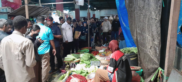 MERAUKE– Menjelang Hari Raya Natal, bupati Merauke Yoseph Bladib Gebze didampingi OPD terkait turun melakukan sidak di Pasar Wamanggu Merauke, Jumat (5/12). Sidak yang dilakukan ini untuk memantau langsung stok dan harga kebutuhan pokok.
