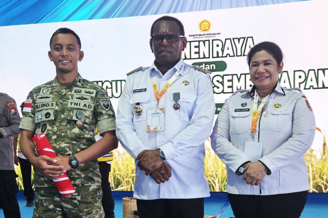 MERAUKE– Bupati Merauke Yoseph Bladib Gebze dan Komandan Kodim 1707/Merauke Letkol Czi Dili Eko Setyawan, menerima penganugerahan tanda kehormatan Satya Lencana Wira Karya dari Presiden Republik Indonesia Prabowo Subianto atas pencapaian swasembada pangan tahun 2025.