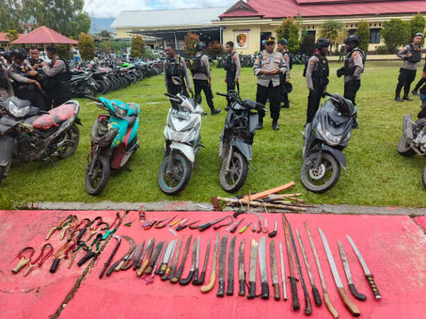 WAMENA– Polres Jayawijaya bersama Personel Brimob Yon A BKO Polda Papua menggelar razia gabungan berskala besar dalam rangka menjaga situasi keamanan dan ketertiban masyarakat di wilayah itu, berhasil mengamankan puluhan senjata tajam dan 9 unit kendaraan roda dua tanpa nomor polisi yang disinyalir merupakan hasil kejahatan.