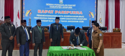 SENTANI – DPR Kabupaten Jayapura menggelar rapat paripurna sekaligus melakukan penandatanganan nota kesepahaman (MoU) antara Pemerintah Kabupaten Jayapura dan DPR Kabupaten Jayapura terhadap Kebijakan Umum Anggaran dan Prioritas Plafon Anggaran Sementara (KUA-PPAS) Tahun Anggaran 2026.
