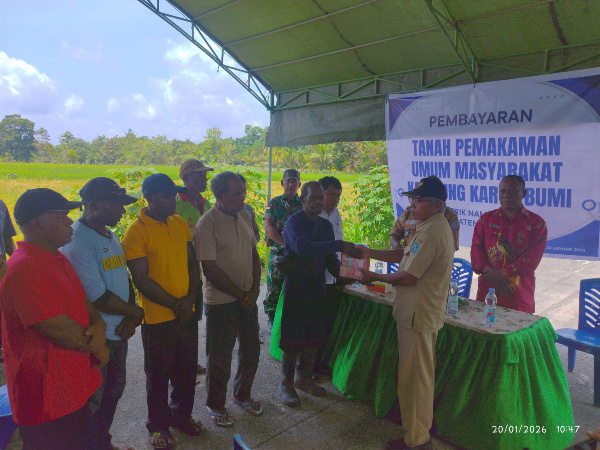 JAYAPURA – Pemerintah Kampung Karya Bumi, Distrik Namblong, Kabupaten Jayapura, secara resmi menyelesaikan pembayaran pelunasan lahan Tanah Pemakaman Umum (TPU) milik masyarakat Kampung Karya Bumi, Selasa (20/1). Pelunasan tersebut diserahkan langsung oleh Kepala Kampung Karya Bumi, Muryani, kepada pemilik tanah, Yohosua Sanggrang Bano.