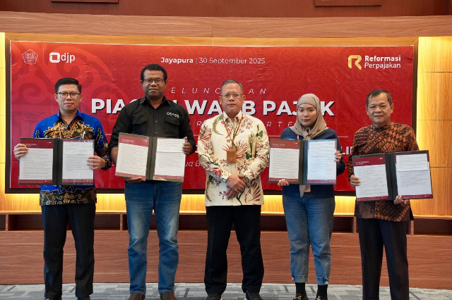 JAYAPURA-Kantor Wilayah Direktorat Jenderal Pajak (DJP) Papua, Papua Barat, dan Maluku (Papabrama) bersama Kantor Pelayanan Pajak (KPP) Pratama Jayapura meluncurkan Piagam Wajib Pajak, Sosialisasi Coretax, serta Forum Konsultasi Publik (FKP) 2025 di Aula Lantai 8 Gedung Keuangan Negara (GKN) Jayapura, Selasa (30/9).